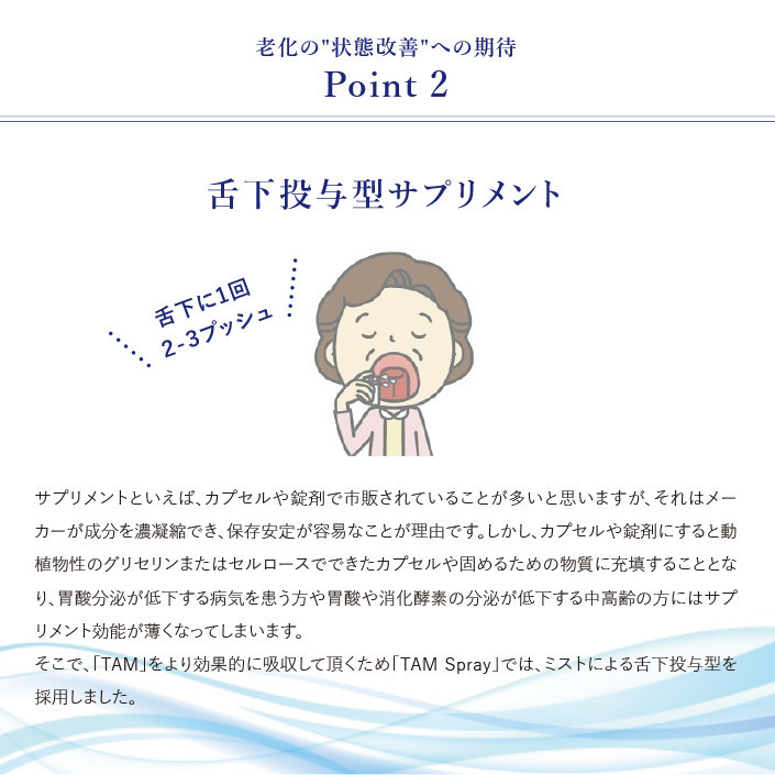 舌の裏側である舌下へ、1日3回を目安にスプレーくださいませ。